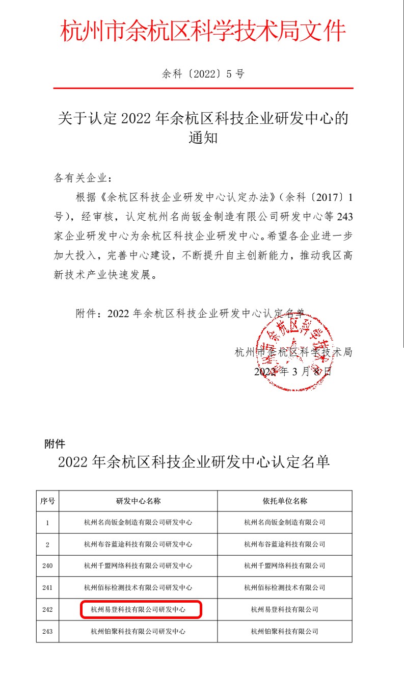 根据《余杭区科技企业研发中心认定办法》,杭州易登科技有限公司被认定为余杭区科技企业研发中心。这是公司在提高自主创新能力、走创新持续发展道路上取得的又一喜人成果,是有关政府部门对我司科技创新能力的认可。